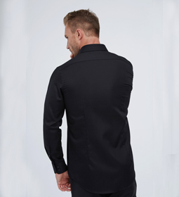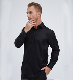 產品特點:熱銷男士100%棉黑色斜紋液氨免熨長袖襯衫,適合職場精英男士穿著,同時休閑上班兩不誤。